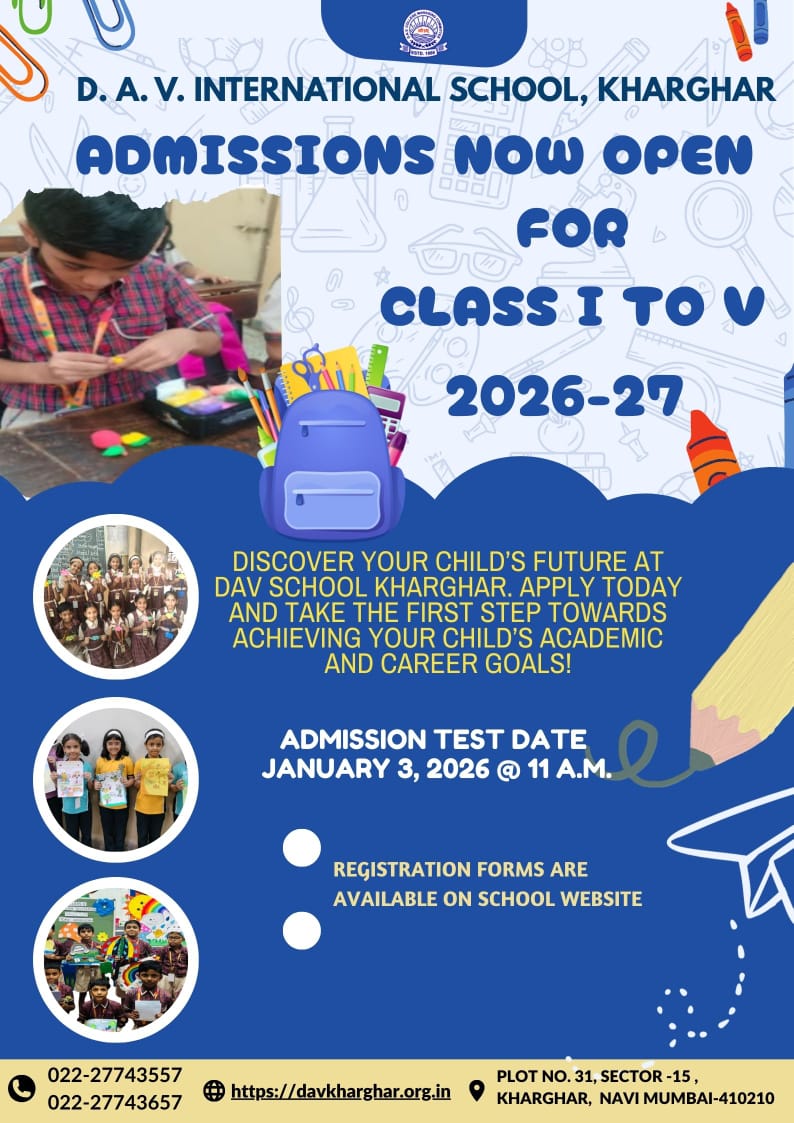 DAV INTERNATIONAL SCHOOL, KHARGHAR PLOT NO.31, SECTOR -15, KHARGHAR, NAVI MUMBAI, RAIGAD, MAHARASHTRA - 410 210 E-Mail : [email protected] Website : https://davkharghar.org.in